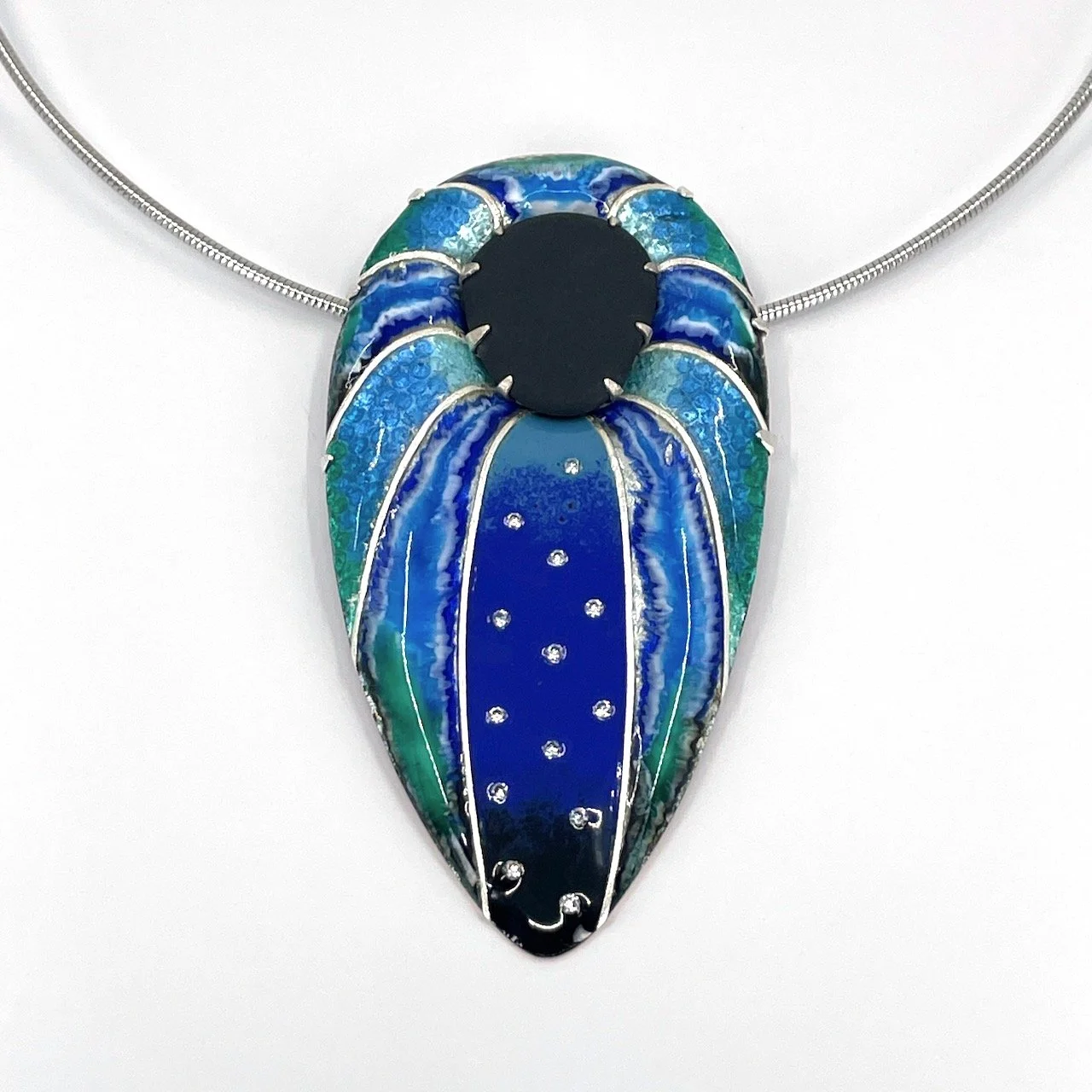 A mathematician by training and employment, Navah took up metalwork and jewellery making at the Baltimore Jewelry Center in 2016 and discovered her particular passion for enamelling there in the winter of 2019. In early 2020, she started working primarily with a kiln and basic tools in her home. Without access to soldering equipment, Navah began exploring settings with cold connections. Her initial, somewhat begrudging work with rivets and tabs soon became enthusiastic as she discovered the creative possibilities of these techniques, particularly the addition of movement and dimension, and the freedom granted by the lack of heat.